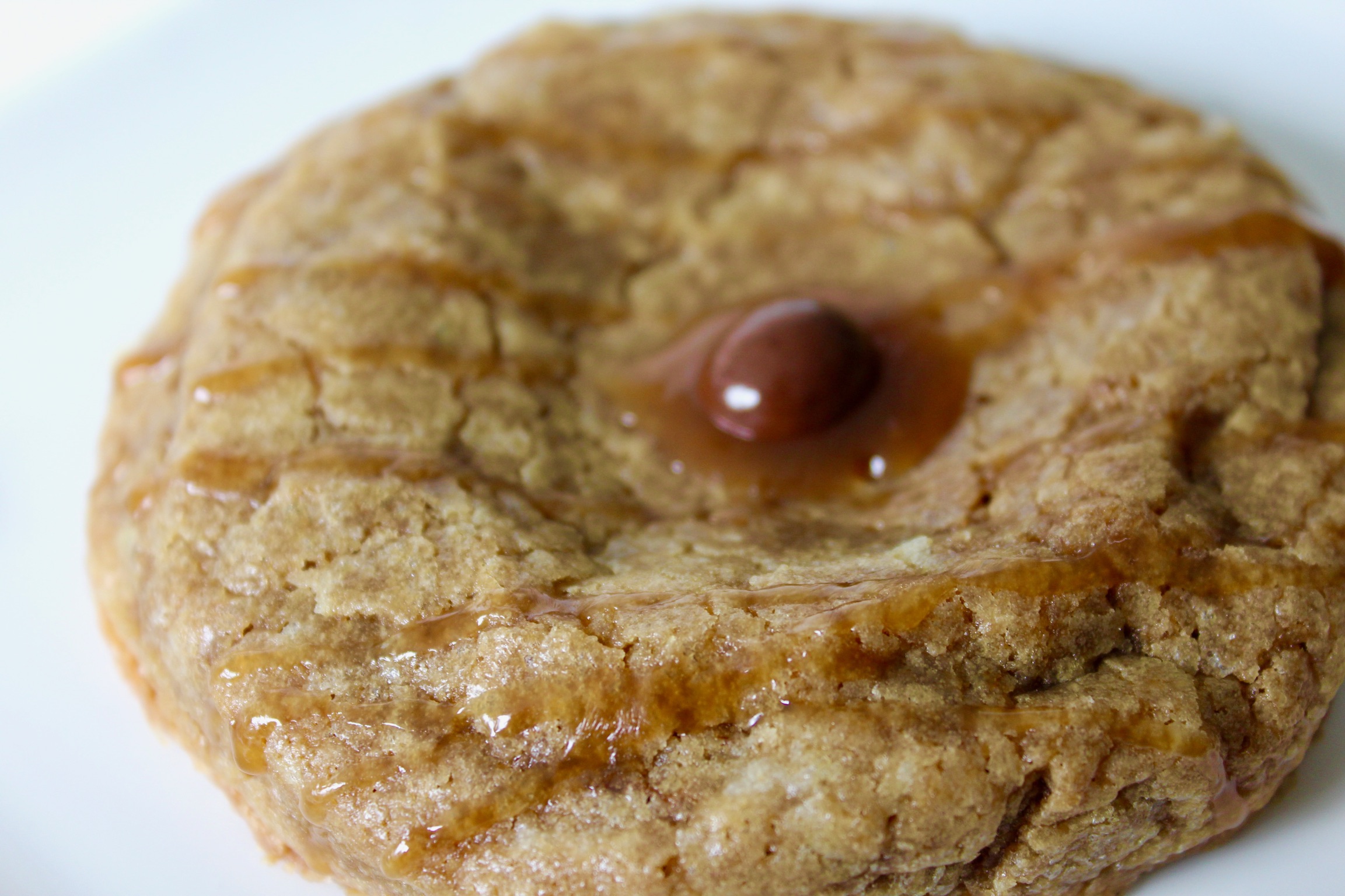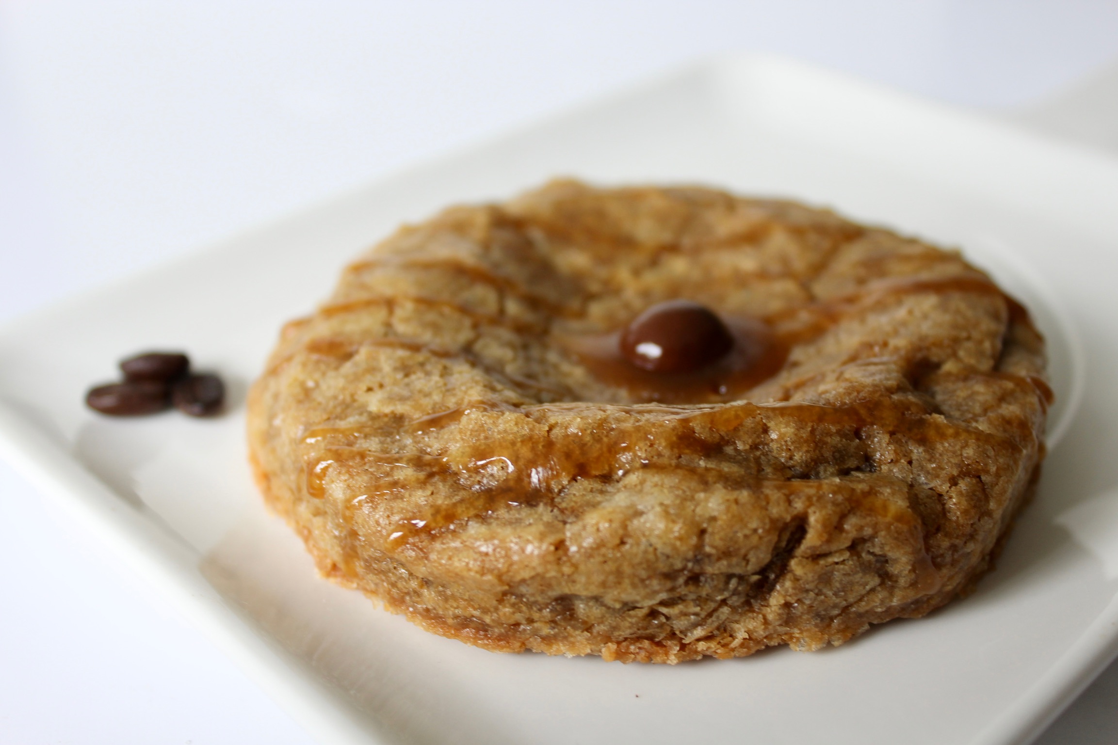 Coffee indulgence – A perfect coffee cookie filled with a gooey caramel center, drizzled with caramel, and topped with a chocolate-covered espresso bean.