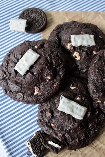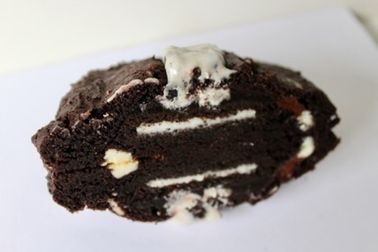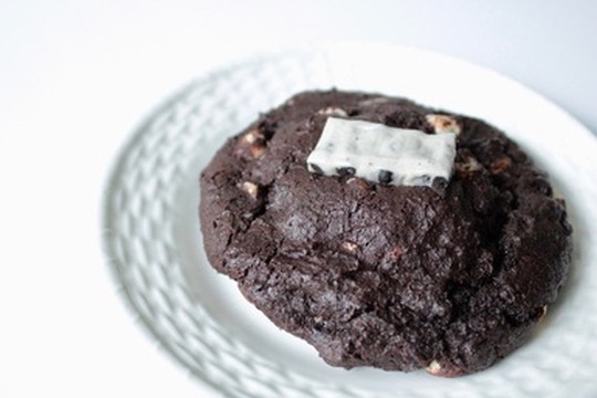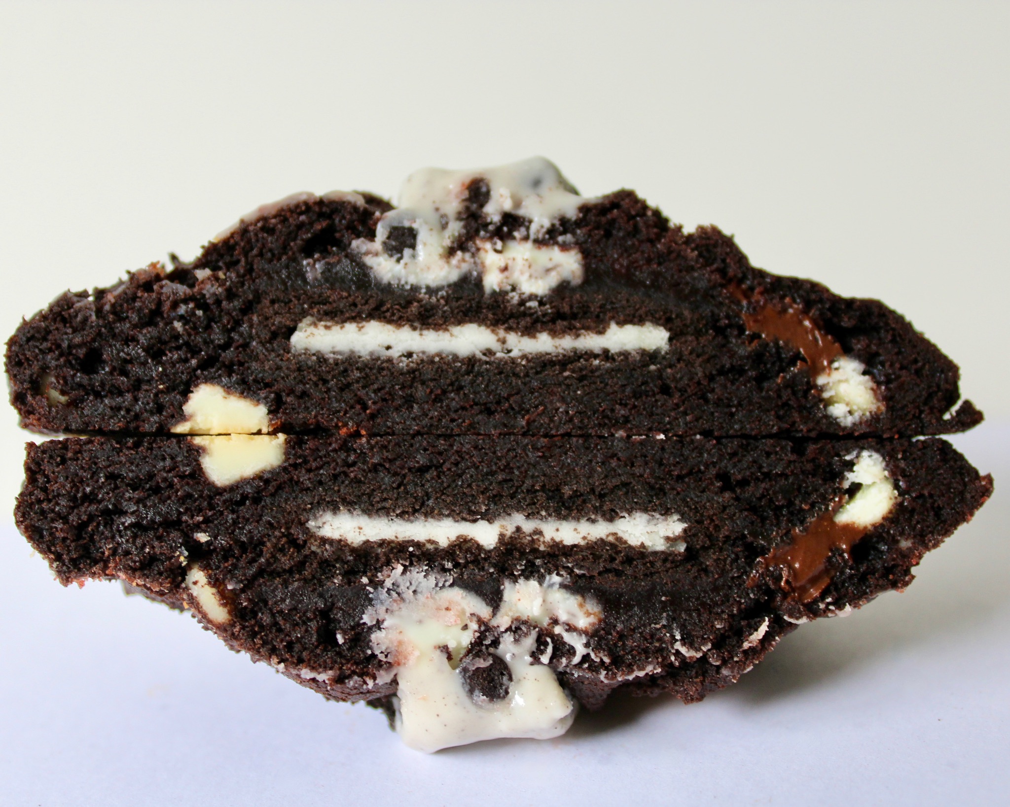 Double dose of chocolate – Chocolate cookie base with white chocolate chips, stuffed with an Oreo and a cookies-and-cream bar.