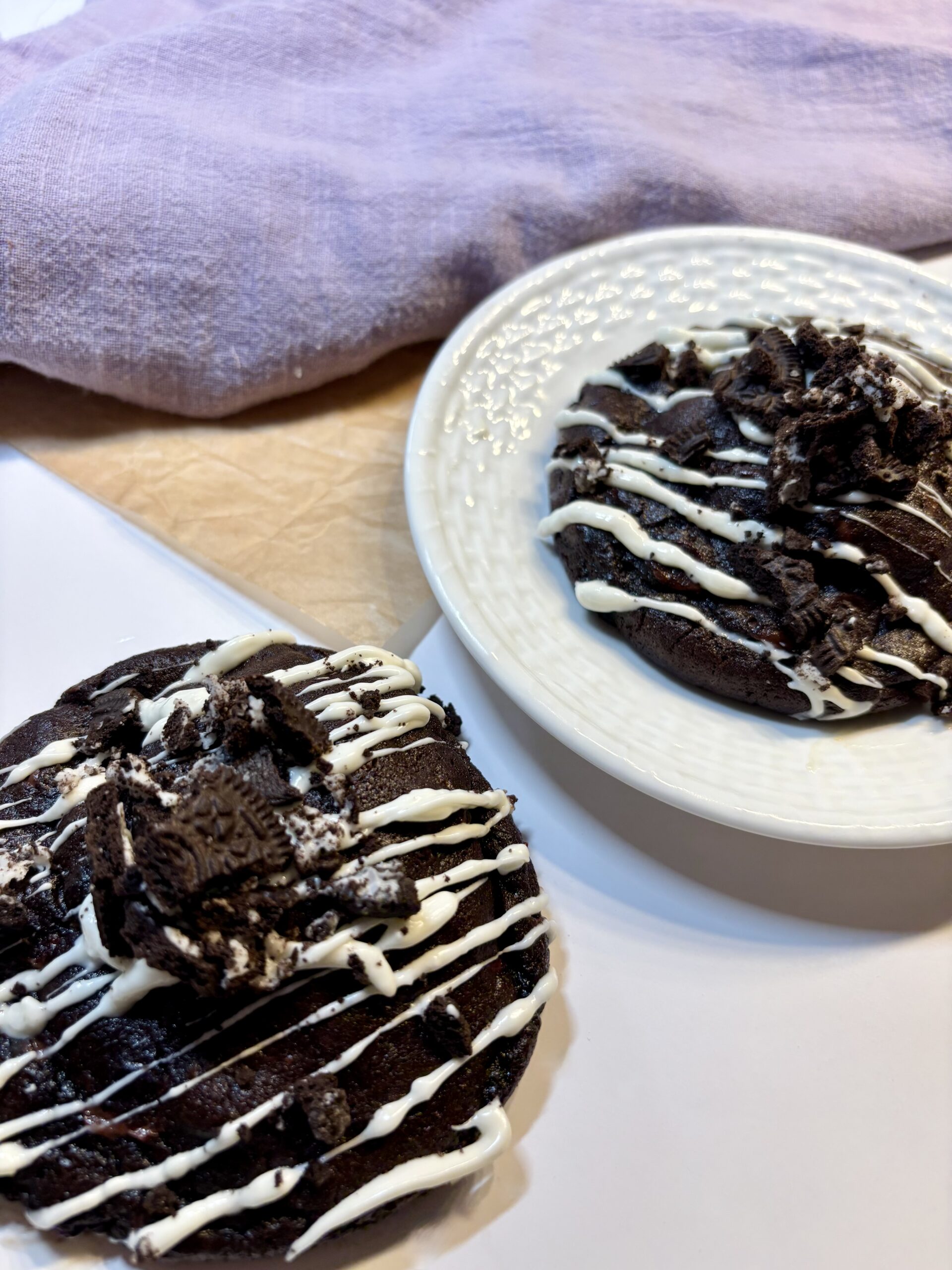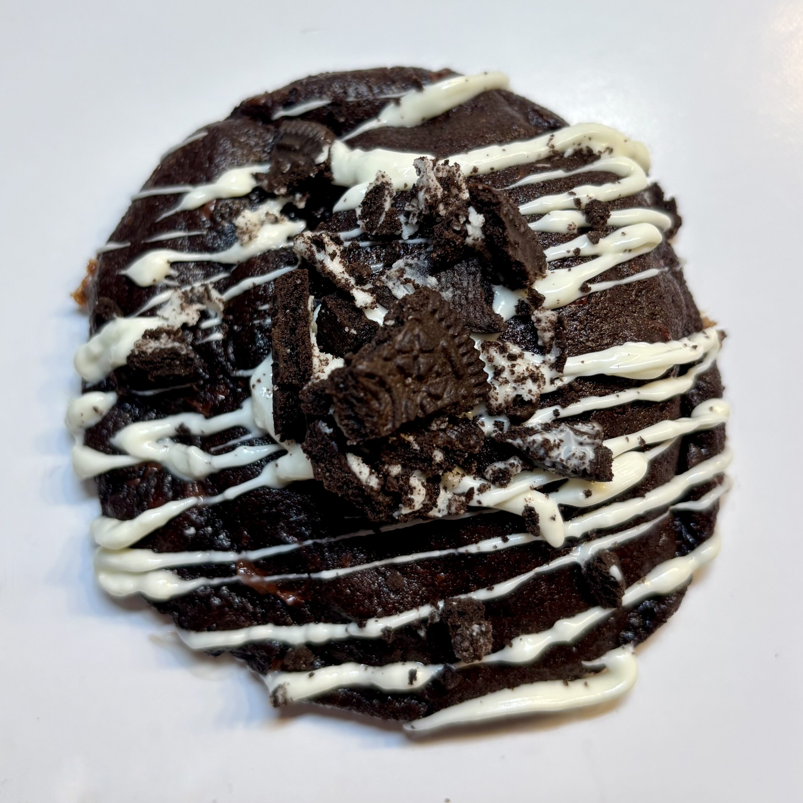Double the chocolate delight. A rich chocolate cookie base loaded with white and semi-sweet chocolate chips, stuffed with an Oreo, and topped with even more chocolate goodness.